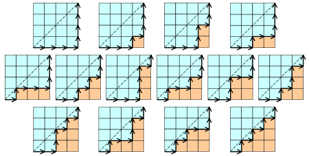 - Cn은 n x n 격자의 왼쪽 아래 꼭지점 (0, 0)에서 오른쪽 위 꼭지점 (n, n)을 향해 최단거리로 이동하는 경우의 수 중 직선 y = x를 넘어가지 않는 경우의 수와 같다. 4 x 4 격자에서 가능한 14가지 경우를 아래 그림처럼 나타낼 수 있다.