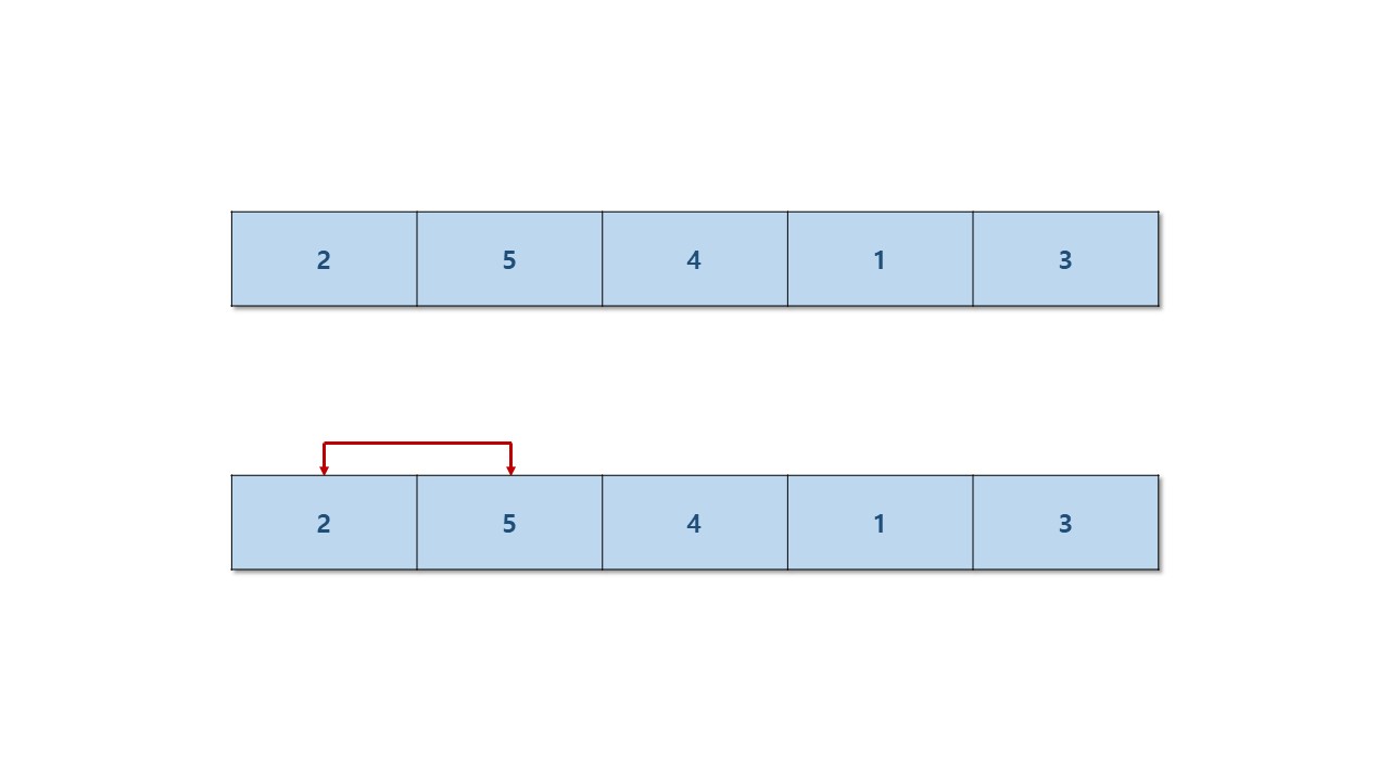 처음 두 수 2, 5는 2가 더 앞에 있으므로 정렬하지 않는다.