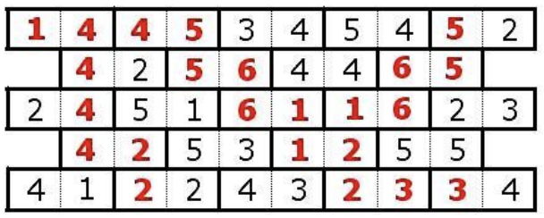 첫째 줄에 N이 주어진다. (1 ≤ N ≤ 500) 다음 줄부터 N*N-N/2줄(/는 정수 나눗셈이다)에는 두 양의 Ai와 Bi가 주어진다. (1 ≤ Ai, Bi ≤ 6, 1 ≤ i ≤ N * N - N / 2) 타일 i의 왼쪽에 쓰여 있는 숫자는 Ai, 오른