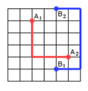 크기가 N×M인 비어있는 회로판에서 두 점 A1과 A2, 그리고 B1와 B2를 전선을 이용해서 이으려고 한다. 전선은 항상 그리드의 수직, 수평선 위에 있어야 한다. 또, 두 직선은 접하면 안 된다. 이 경우에 필요한 전선의 길이의 최솟값을 구하는 프로그램을 작성하시오. 전선은 회로판 바깥으로 나갈 수 없다.